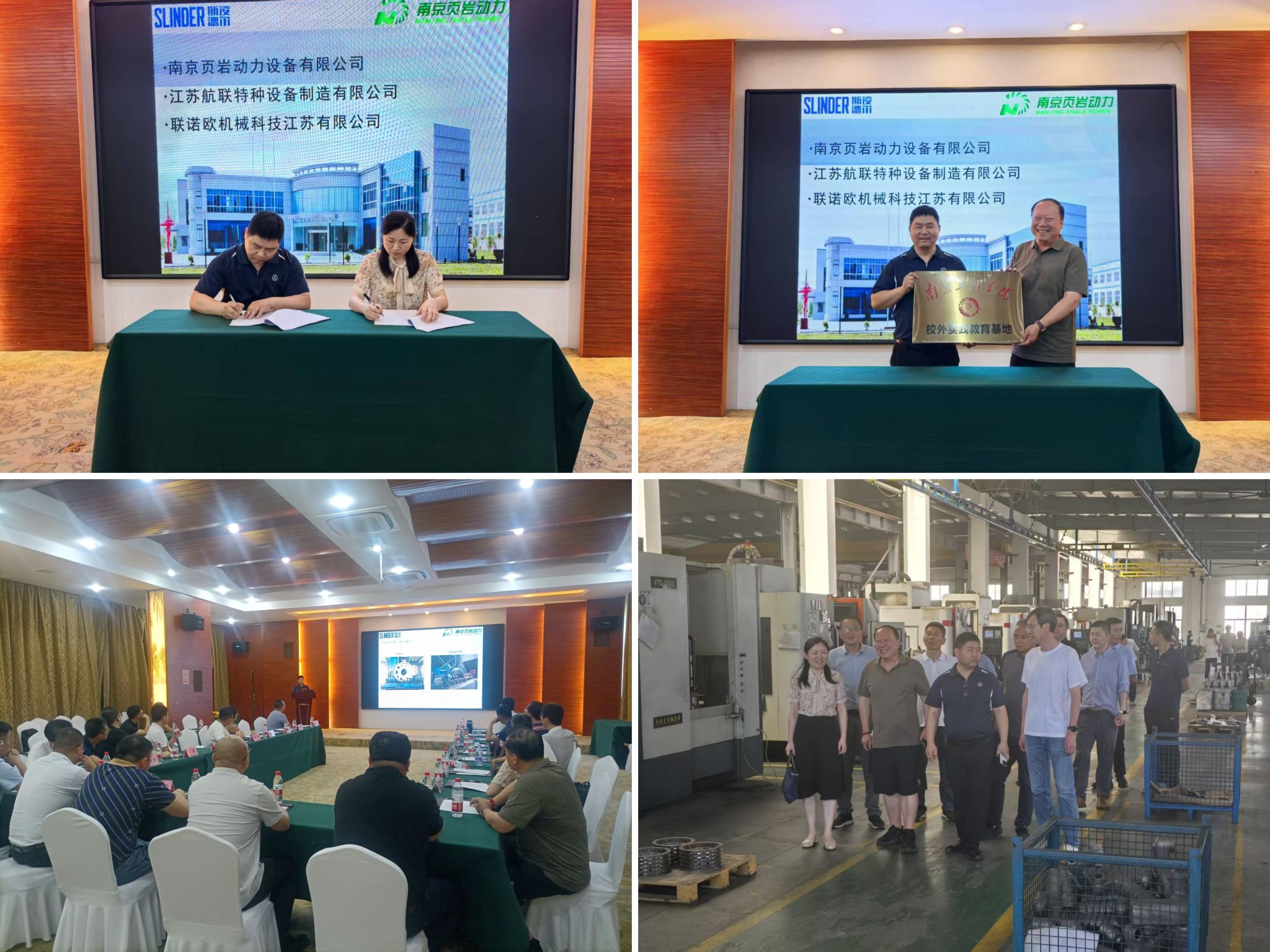 联诺欧江苏公司总经理、校友朱昌龙详细介绍了集团在动力设备研发制造领域的发展情况,南京微伽自动化总经理孙健分享了公司在非标自动化方面的技术优势及公司成功签约比亚迪自动化生产线项目情况,其他与会代表也针对各自公司产品等方面进行积极交流,期待通过本次活动寻求合作机会。校友们实地考察了页岩动力公司新能源设备生产线,并就机械加工协作达成合作意向。自动化学院副院长刘娣与页岩动力签订了教育实践基地协议,机械凯发原党委书记刘庆国为企业揭牌。